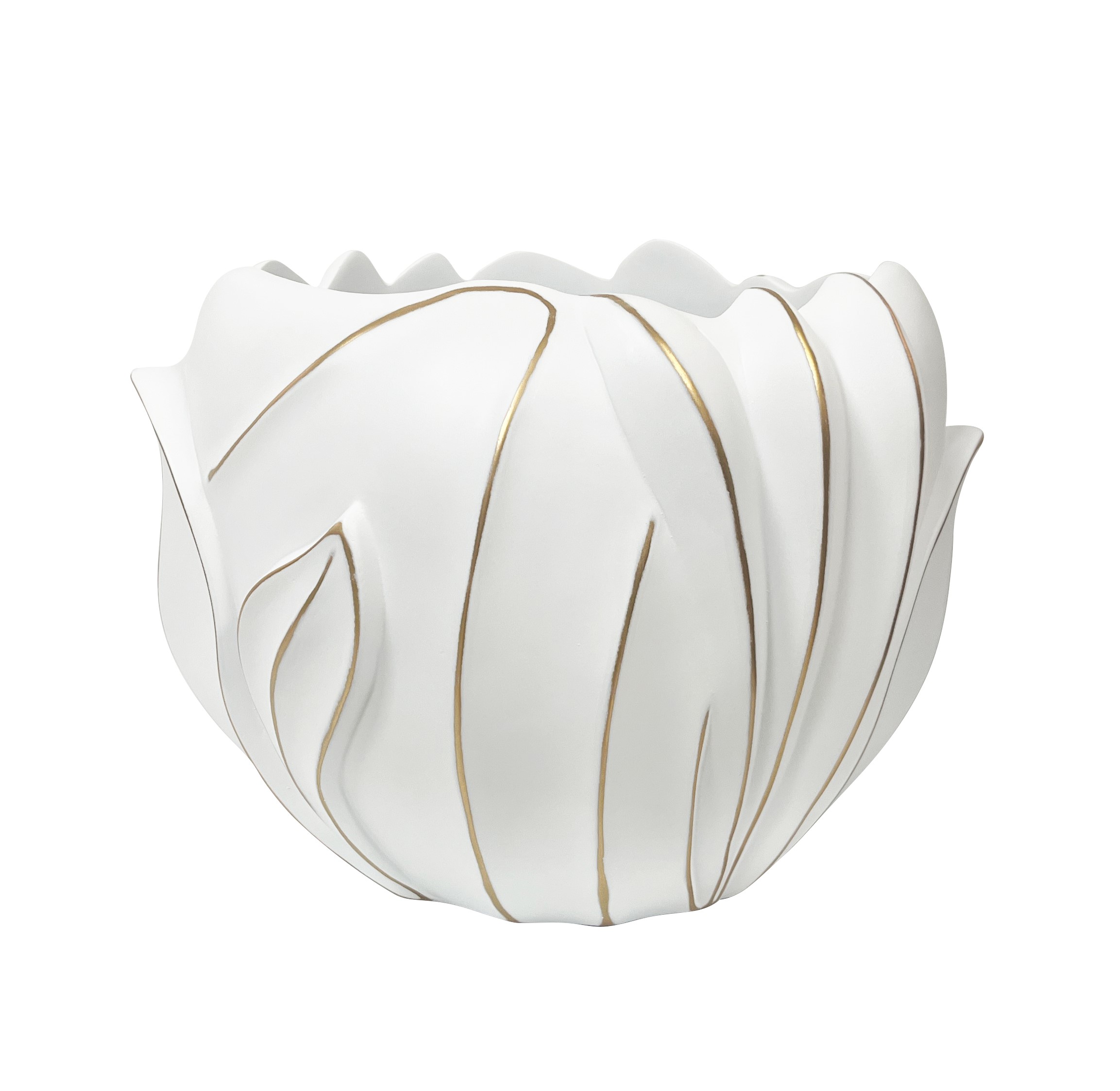 Add a touch of artistic elegance to your home with this Sculpted White Polyresin Decorative Pot, beautifully crafted to mimic the gentle curves of a blooming tulip. Made from durable polyresin, this pot combines lightweight practicality with high-end design, featuring a matte white finish that brings a clean, modern look to any setting. Graceful, flowing lines are highlighted with metallic gold accents, emphasizing the organic shape and giving it a refined, luxurious appeal.