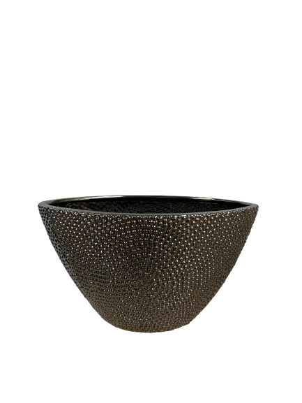 The Midnight Noir Textured Ceramic Pot can add a touch of luxury to your decor with this textured Silver decorative pot. Crafted from high-quality ceramic, this bowl features a dimpled or hammered texture that radiates in concentric circles, creating an eye-catching visual effect. Its sleek, rounded oval shape with a wide-open top and narrow base add elegance and sophistication to any space.